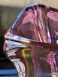 The striking feature of this piece is the 'doublé' or 'cased' crystal technique, where a layer of colored glass is cased over a clear crystal base. In this case, a rich, deep amethyst or fuchsia-pink layer is expertly applied and then cut away in a swirling, vertical pattern, revealing the dazzling clear crystal beneath. This technique not only adds a vibrant depth of color but also allows the crystal's clarity and brilliance to be highlighted as light refracts through the different layers.