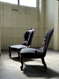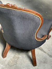 A pair of elegant late 19th-century Louis Philippe chaufuesses, or slipper chairs, are presented with a refined and stylish demeanor. Their dark wood frames showcase the characteristic simplicity and subtle curves of the era. The serpentine crest rail, a hallmark of the style, is delicately carved with a small, foliate flourish, adding a touch of understated ornamentation. Upholstered in a deep, midnight blue velvet, the chairs exude a sense of luxurious comfort. The button-tufted backrests provide both a visual and tactile richness, while the smooth seats are bordered with a line of decorative nailhead trim. Graceful cabriole legs terminate in scroll-shaped feet, a nod to earlier French designs. The chairs' low profile and intimate scale make them ideal for a cozy corner or as sophisticated accent pieces in a formal setting. These chaufuesses are not merely functional seating but are decorative objects in their own right. They represent the seamless blend of comfort and style that defined the Louis Philippe period.