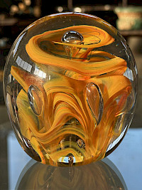 The paperweights are a captivating study in controlled chaos. Each piece showcases a unique internal composition of vibrant, swirling colors, such as cobalt blues, rich ambers, and fiery reds, suspended within a clear, polished crystal dome. The use of techniques like controlled bubbles, ribbons of color, and subtle metallic or iridescent inclusions creates a sense of dynamic movement and depth.