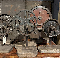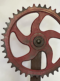 An artful duo of cast-iron sculptures, each a cog in a magnificent steampunk narrative. The foreground piece, a large, crimson gear with a serrated edge, rests proudly on a substantial wooden plinth, its surface a mosaic of chipped paint and authentic patina. It is a monument to the romance of the machine age. Behind it, a smaller, weathered paddle wheel with a similar patina stands as a symbol of perpetual motion. The contrasting textures of the iron and wood, combined with the backdrop's aged metal, create a powerful and stylish display of repurposed industrial artifacts.