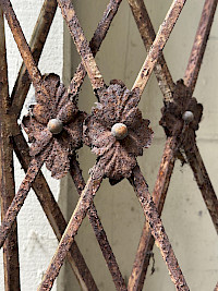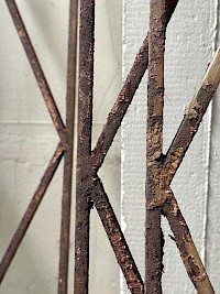 Each gate features a striking, rigid rectangular frame enclosing a classic diamond or trellis pattern created by intersecting iron bars. Their primary function as heavy-duty window or door security lends them a strong, utilitarian appeal.