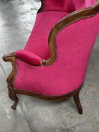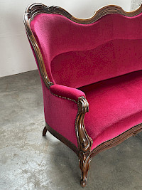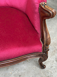The entire piece is sumptuously upholstered in a vibrant, jewel-toned red velvet fabric. The extensive padding and plush fabric emphasize the period's focus on comfort and luxury, making this a true statement piece for a formal salon or library.