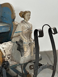 The front of the sleigh is highly distinctive, featuring a carved woman figurehead seated prominently, flanked by two hounds.
