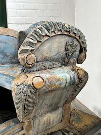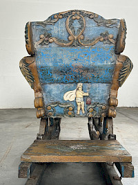 The sleigh shows clear signs of its age and history, including traces of wear and cracks in the thick wooden structure and painted surfaces, as well as rust on the iron runners and cast iron supports.