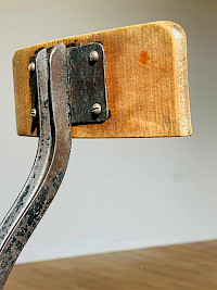 The Pivoting Lumbar: Topping the steel curve is a small, articulating solid wood backrest, designed to follow the movement of the sitter—a sophisticated touch for a 1950s industrial piece.