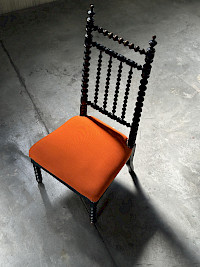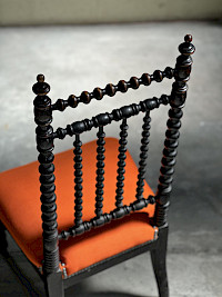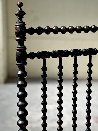 This is a striking Napoleon III bobbin-turned Nurse chair. The chair features a high back and four legs, all crafted with the distinctive bobbin turning technique, which gives the piece a rhythmic, beaded appearance. The wood has been finished in a deep, rich black lacquer. Light wear consistent with age and use.