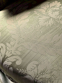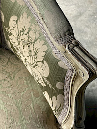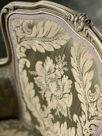 This is a pair of Louis XV style bergère chairs, elegant and stately in their form. The chairs feature a delicate, cream-painted frame with carved foliate and rocaille motifs characteristic of the mid-18th century French aesthetic. The serpentine lines of the frame flow into gracefully cabriole legs, culminating in scrolled feet. They are upholstered in a light green floral tapestry fabric, which is slightly worn, lending a charming patina of age. The fabric pattern features a repeating motif of stylized flowers and foliage, beautifully complementing the carvings on the chairs' frames. The bergères are distinguished by their fully upholstered sides, known as 'a la reine' style, which provides exceptional comfort. The chairs are currently in a preserved but used condition, showing signs of their history and previous use. They possess a timeless and romantic quality that makes them suitable for a variety of elegant interiors.