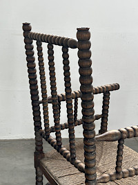 The chair retains its original woven rush seat, which provides a textural, natural contrast to the dense, dark wood frame. The combination of the bold turning and the rush seat captures the distinctive character of transitional Dutch craftsmanship from the 1900s. The piece is both visually arresting and a testament to traditional woodworking skill.