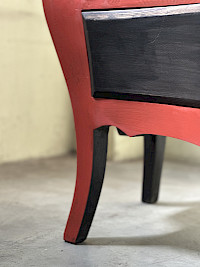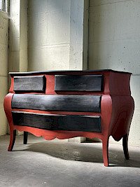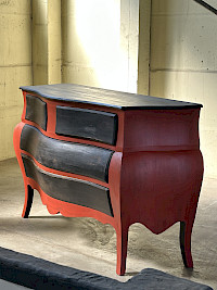 Its four drawers are given a rich, matte coal black finish. The top two drawers are rectilinear, while the bottom two follow the commode's serpentine or bombe curves, creating an arresting visual rhythm. The two-tone finish—blood red body and coal black drawers and top—enhances the furniture's sculptural quality and makes a powerful, unforgettable statement. This unique piece perfectly bridges historical artistry with contemporary rock-and-roll chic.