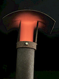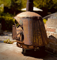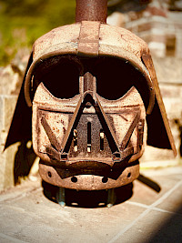 This unique piece is a handmade fire pit, creatively fashioned from a repurposed butane bottle, designed to resemble the iconic helmet of Darth Vader. Its vintage aesthetic is immediately apparent, with a cortensteel surface. The rust gives the helmet a rich, earthy color palette of deep browns, coppers, and ochres. The helmet's main body is made from the rounded shape of the butane bottle, with the characteristic ridges of Vader's mask crudely but effectively cut into the metal. The eye and mouth openings are jagged and hollow, serving as the vents for the fire pit. The top of the helmet is fitted with a tall, cylindrical smokestack, which, like the rest coevered in cortensteel.