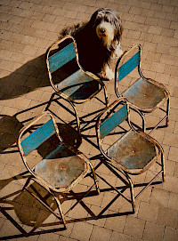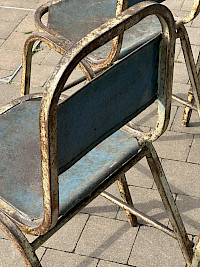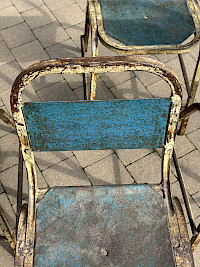 4 vintage industrial stackable chairs with a distinct patina. The chairs feature a tubular steel frame and have been weathered over time, creating a distressed, rustic finish. The original paint, which appears to be a vibrant blue, has chipped and faded, revealing the rust and metal beneath. This gives them a beautiful, aged look. The style is utilitarian, with a simple, functional design. They are reminiscent of chairs from mid-20th century schools, factories, or public spaces.